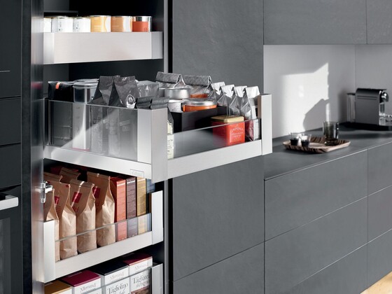 SPACE TOWER include toate feroneriile utilizate din programul standard. Pe lângă sistemele box LEGRABOX, MERIVOBOX sau TANDEMBOX antaro sunt posibile şi sertare de lemn echipate cu MOVENTO sau TANDEM. Acest lucru asigură un design uniform în întreaga bucătărie şi libertatea personalizării interiorului dulapului.
