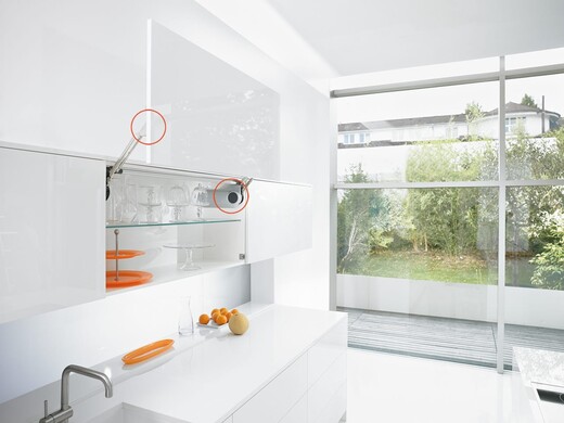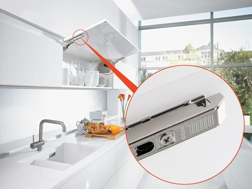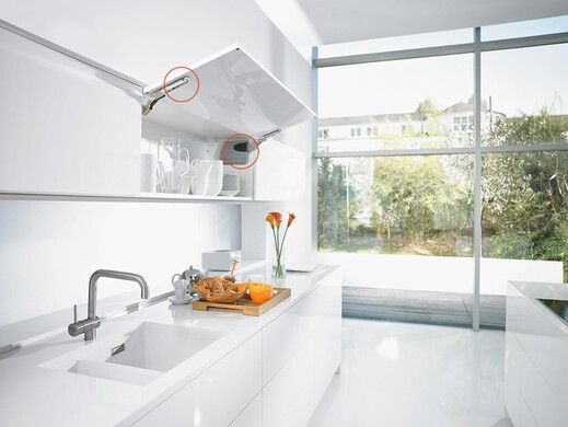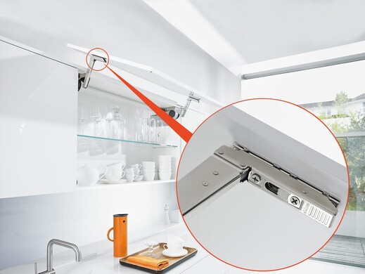 AVENTOS HK-S passar utmärkt för mindre klaffar i högskåp, t.ex. ovanför kylen eller frysen. Fronten lyfts och svängs uppåt.