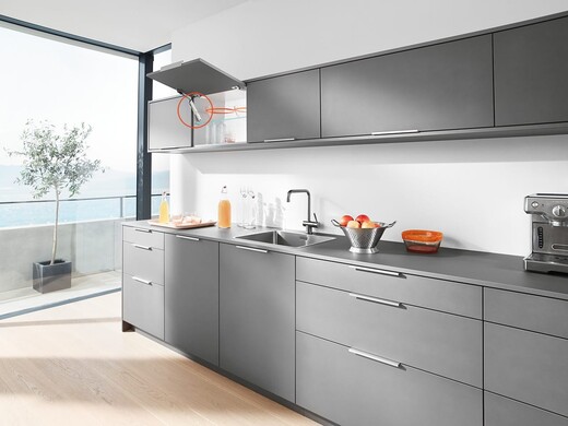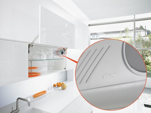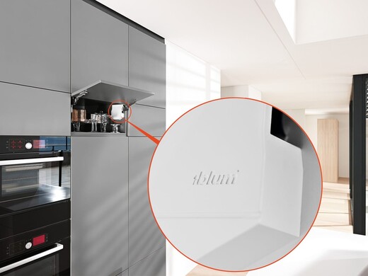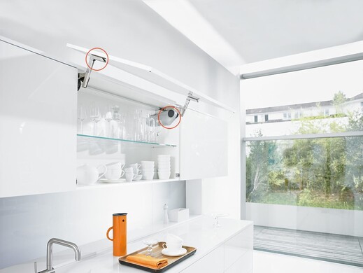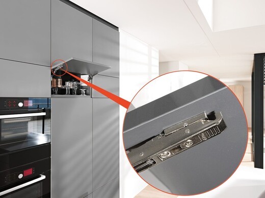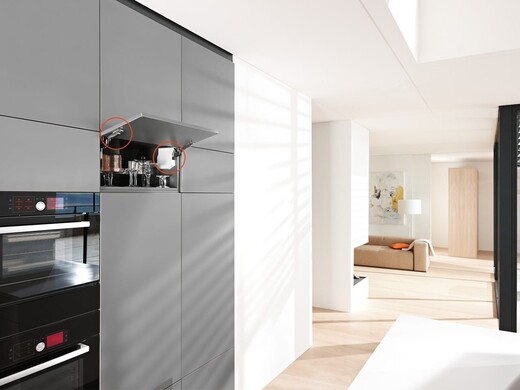 Lyftklaffen för vertikala fronter AVENTOS HL lyfter fronten uppåt, parallellt med skåpstommen. Det möjliggör speciella monteringssituationer såsom inbyggnad av elektriska apparater i högskåp.