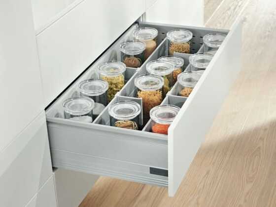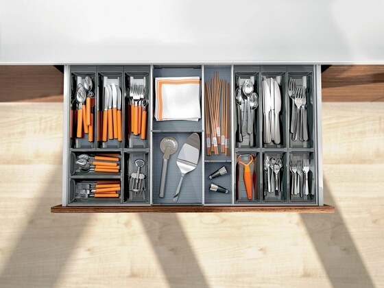 Skapa välkommen ordning i alla dina lådor och utdrag. Oavsett om det handlar om bestick, flaskor eller grytor - samtliga förvaras säkert och lättåtkomligt. Välj ORGA-LINE-inredning till din utställning efter behov och typ av användning. Påbyggnadssidan BOXSIDE ger extra stöd för innehållet i de djupa skåputdragen.