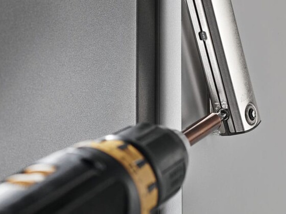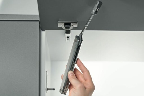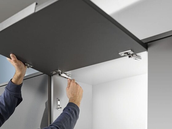 The assembly of AVENTOS HK-XS components is virtually tool free. Adjust the lift mechanism precisely to the weight and size of the front and AVENTOS HK-XS will open, close and hold with reliable ease. Combine it with CLIP top BLUMOTION hinges and the small stay lift will close softly and effortlessly.