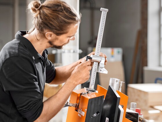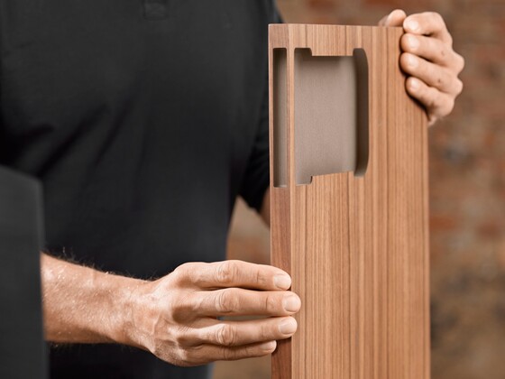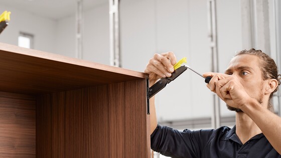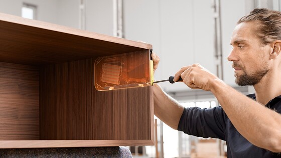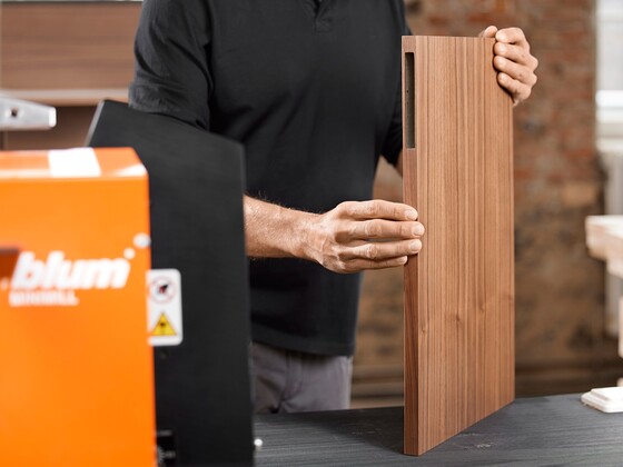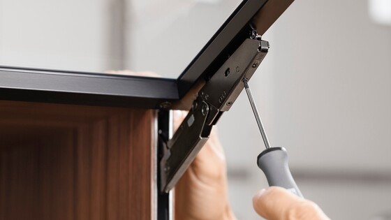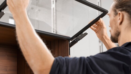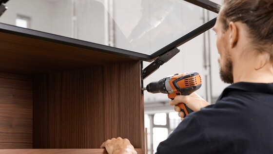 A well-filled glass of sawdust is all you need to integrate AVENTOS HKi into the cabinet side. Choose for yourself how to blend our narrowest lift system seamlessly into the furniture from a variety of assembly options: depending on the equipment in your workshop, the number of fittings being used and whether or not you want to outsource any steps in the process.
