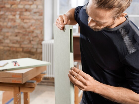 Our pre-routed MDF raw boards set already has the central recess for AVENTOS HKi. Cut the raw board measuring 450 mm x 600 mm x 19 mm to your desired size and veneer or varnish the board according to your requirements.