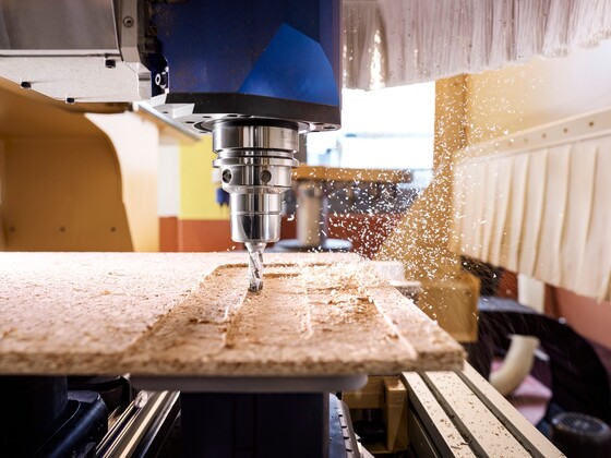 First, use the CNC machine to mill out the edge for the lift mechanism at the front. Working from the outside, the rest of the milling work is then carried out on the side. The characteristic feature of this variant is a thin strip of wood left at the front of the cabinet side panel, which allows the lift mechanism to be completely integrated into the side panel. A furniture element – either a cabinet or crown moulding – is then added at the end to cover the opening at the side.