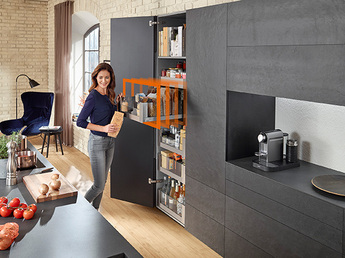 TANDEM está disponible para las clases de carga de 30 kg y 50 kg. Con el sistema de guías oculto, es posible utilizar módulos extraíbles altos, anchos y profundos a ras del suelo. Esto se debe a su estabilidad y sus buenos valores de caída, incluso si el cajón está completamente lleno. De este modo, sus clientes obtienen un valioso espacio de almacenaje en todos los sectores de la casa.