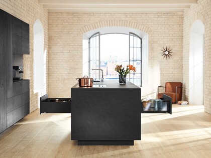In addition to LEGRABOX pure with matt, metal finishes, the LEGRABOX free design version allows height C high fronted pull-outs to be customised to individual designs. Whether glass, wood, leather or stone — large design elements create special highlights.