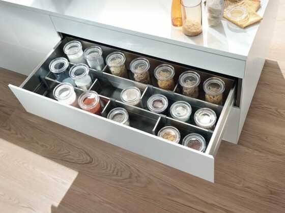 The easy way to beautifully organise your drawers or high fronted pull-outs. No matter whether cutlery, bottles, pots and pans - everything is nicely tidied away. Tailor your storage space to your needs using the ORGA-LINE inner dividing system.