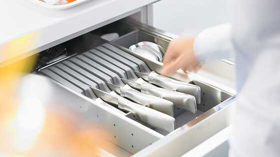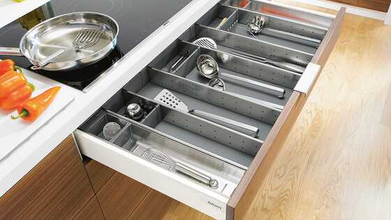 Якісна система внутрішніх розділювачів, яка гарантує бездоганний порядок у будь-якій шухляді. Столове приладдя, пляшки, каструлі – все кухонне приладдя можна розмістити надійно і комфортно. Організуйте корисний простір так, як зручно Вам