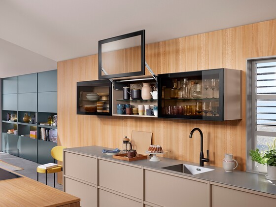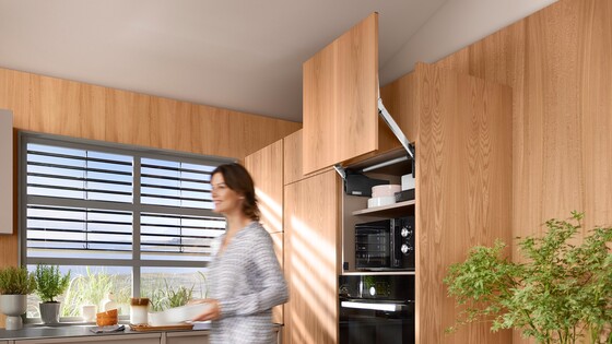 Здивуйте Ваших клієнтів підіймачами, що повністю звільняють зону для роботи: фасади з AVENTOS HL top підходять для шафок, які знаходяться над та на робочій поверхні. У шафці для зберігання на робочій поверхні вдасться елегантно приховати електричні пристрої.