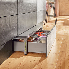 The SPACE TOWER pantry unit can be equipped with different motion technologies to make it even easier to use. With the SERVO-DRIVE electrical system, drawers open automatically with just a light touch and close softly thanks to built-in soft-close BLUMOTION. Or, you can choose TIP-ON BLUMOTION, a mechanical option that combines push-to-open and soft-close features. For handleless doors, TIP-ON lets you open them with a simple push.