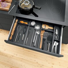 To incorporate handleless fronts in cabinets, simply combine MERIVOBOX with the TIP-ON BLUMOTION mechanical opening support system. This combination is possible thanks to the fully redesigned, innovative L-shaped cabinet profile of MERIVOBOX. Different TIP-ON BLUMOTION units are available to suit different nominal lengths and weight ranges. All other components are universal.